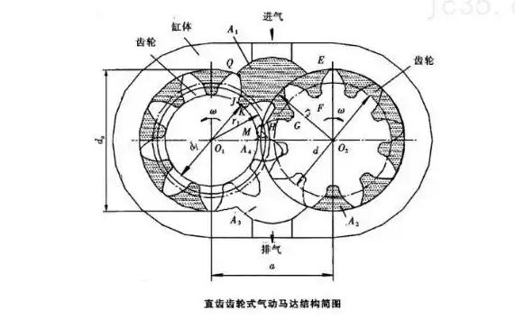 - 結構組成:工作室由一對齒輪構成,壓縮空氣由對稱中心處輸入。