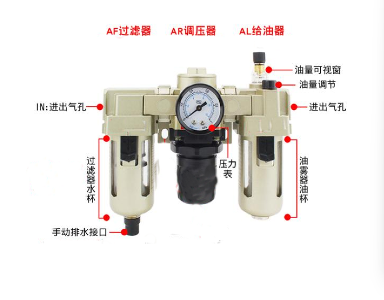 安裝順序是嚴格固定的: 進氣方向先經(jīng)過 過濾器,然后到 減壓閥,最后通過 油霧器 輸出。這個順序不能顛倒。